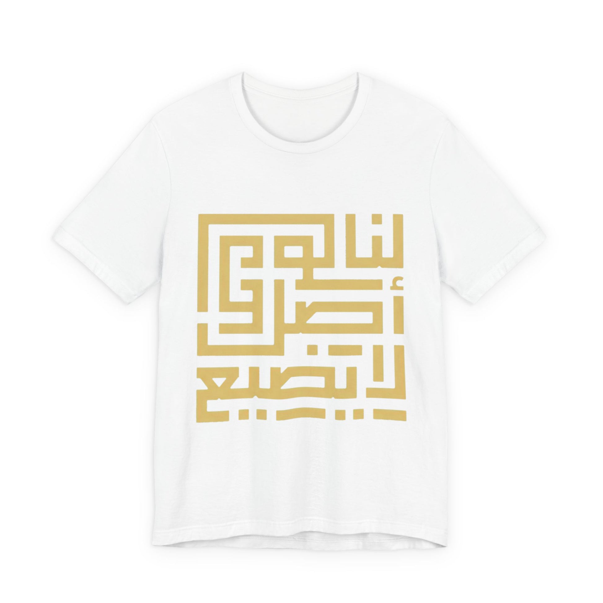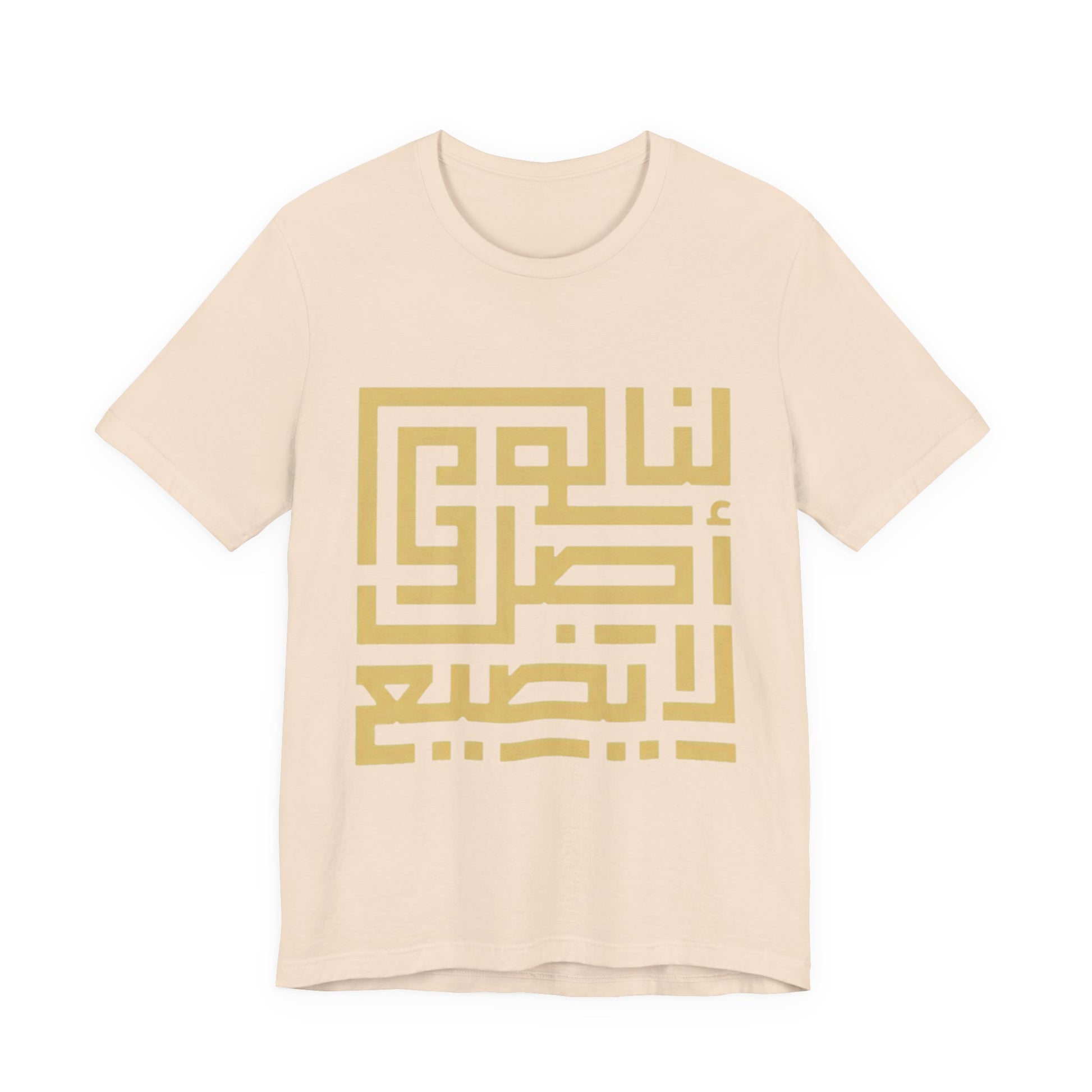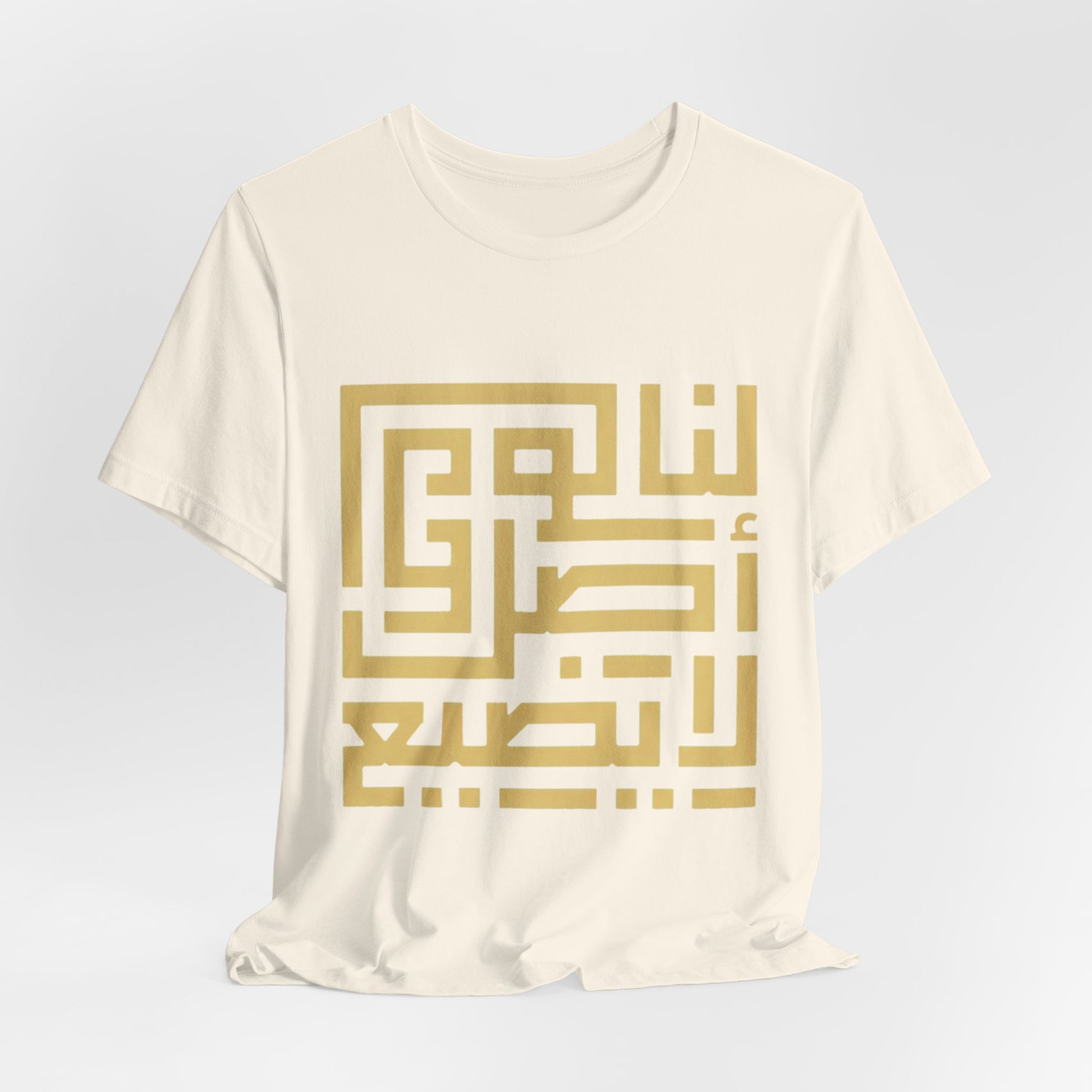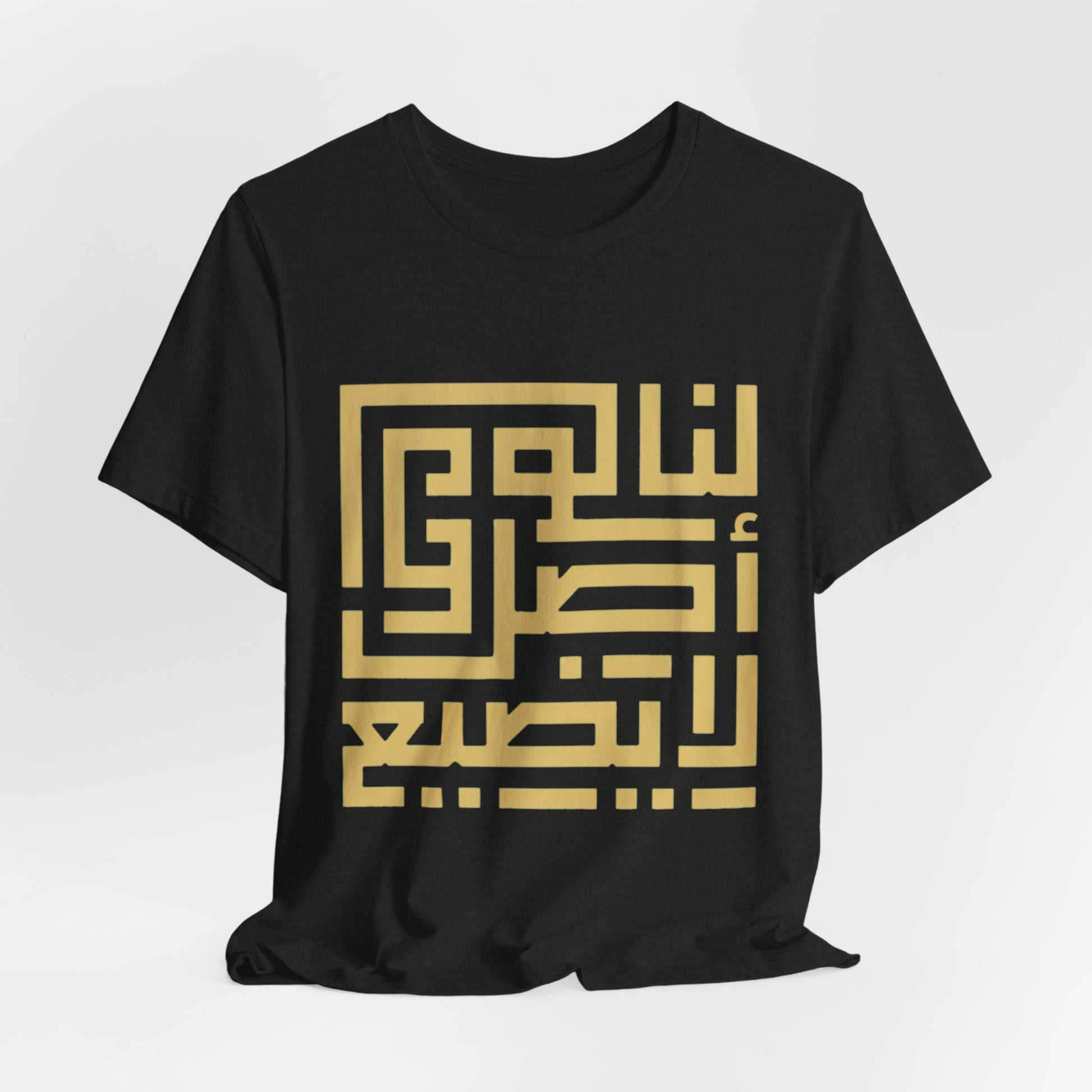 A lightweight, breathable jersey tee with a bold, geometric Arabic calligraphy square printed in warm gold at the chest. The Arabic script reads لنا أصلٌ لا يضيع which translats to: We have an origin that will not be lost