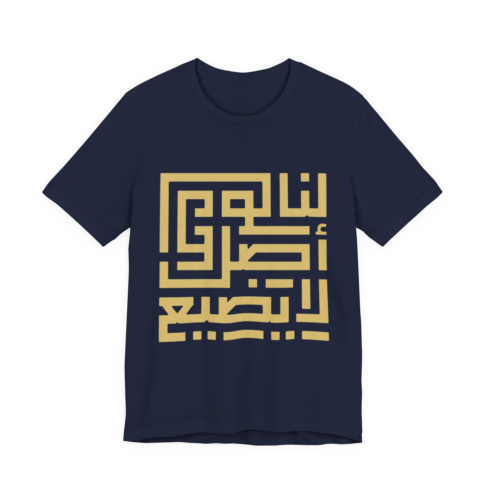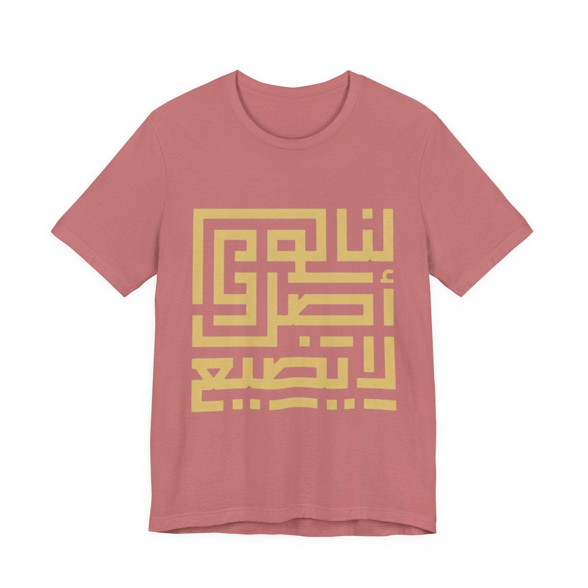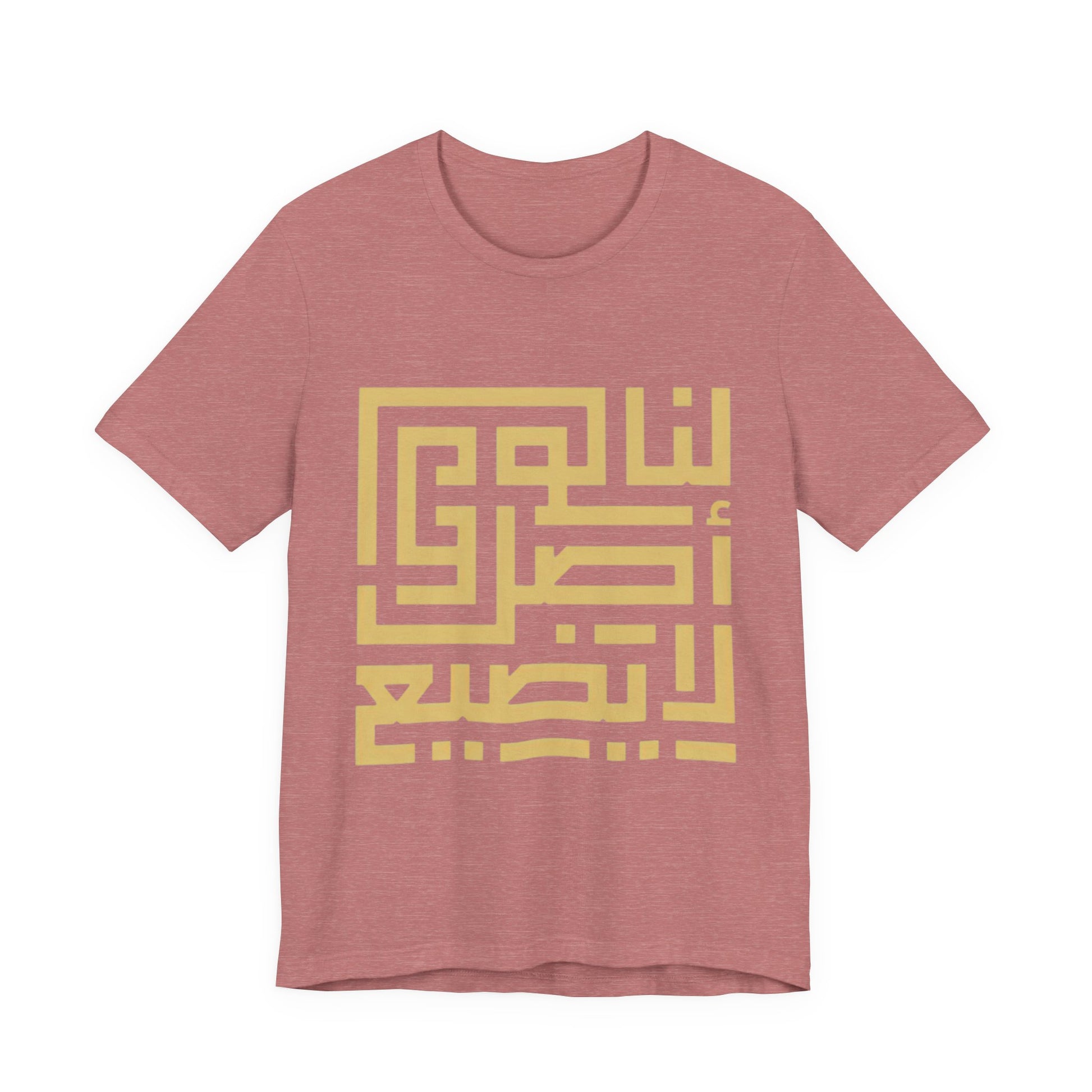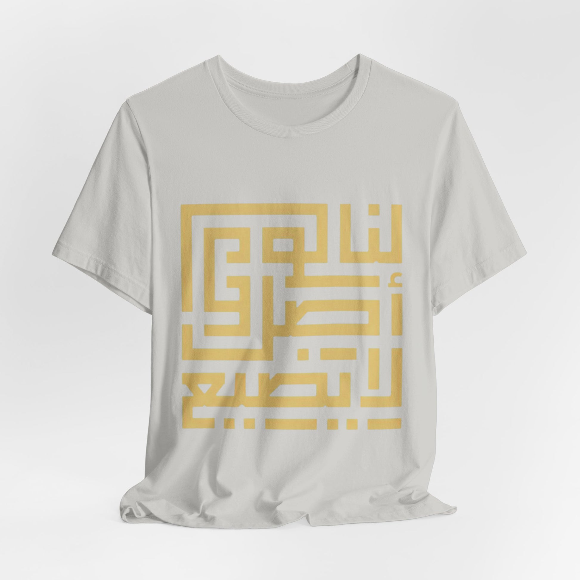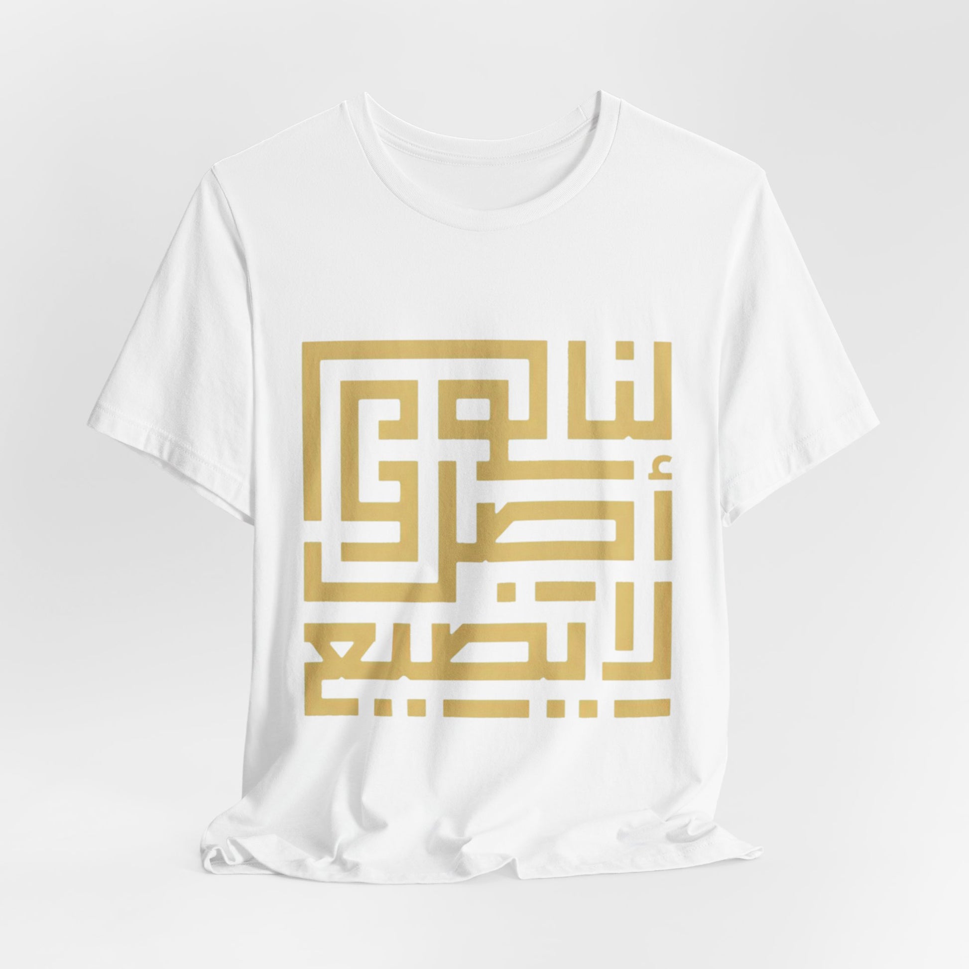 A lightweight, breathable jersey tee with a bold, geometric Arabic calligraphy square printed in warm gold at the chest. The Arabic script reads لنا أصلٌ لا يضيع which translats to: We have an origin that will not be lost
