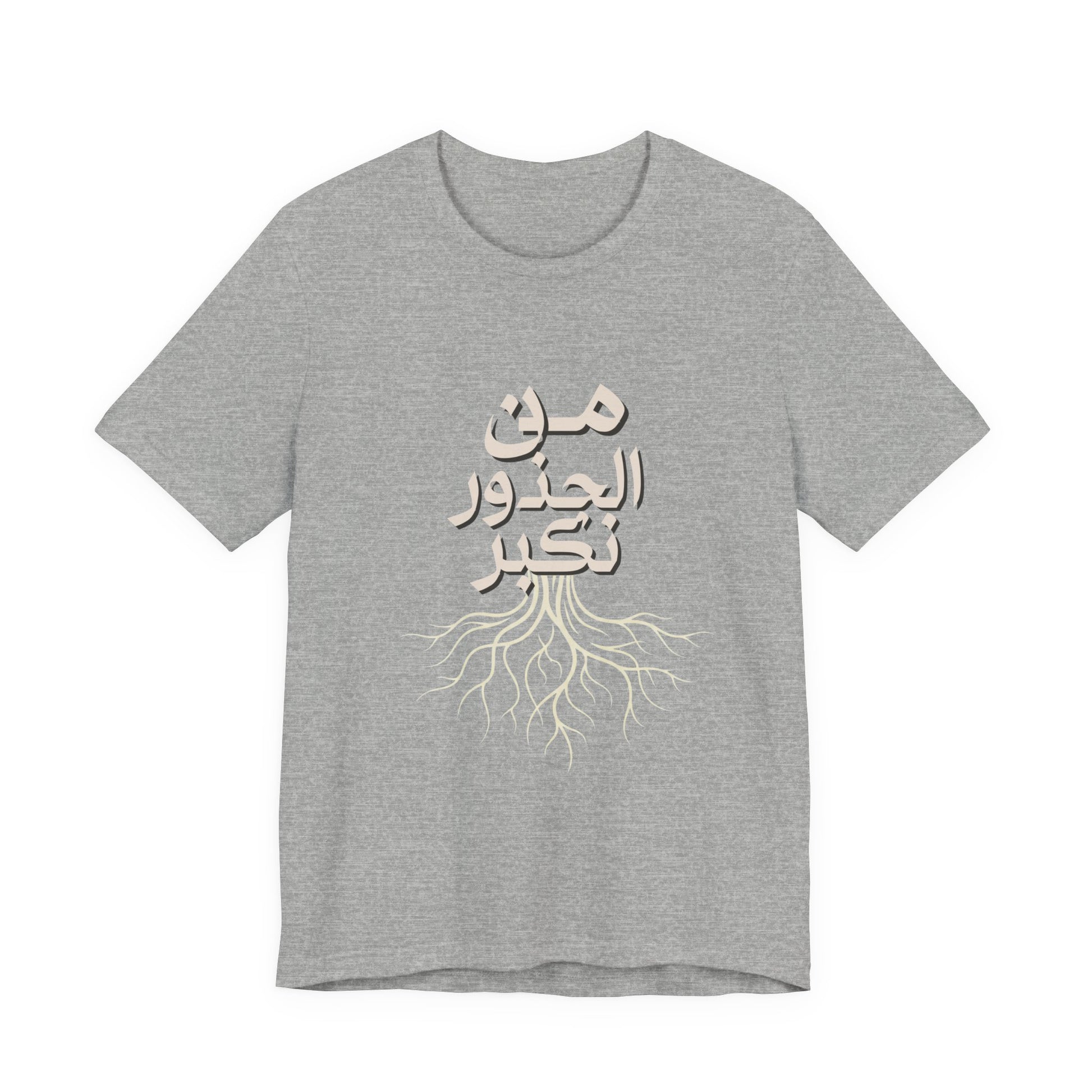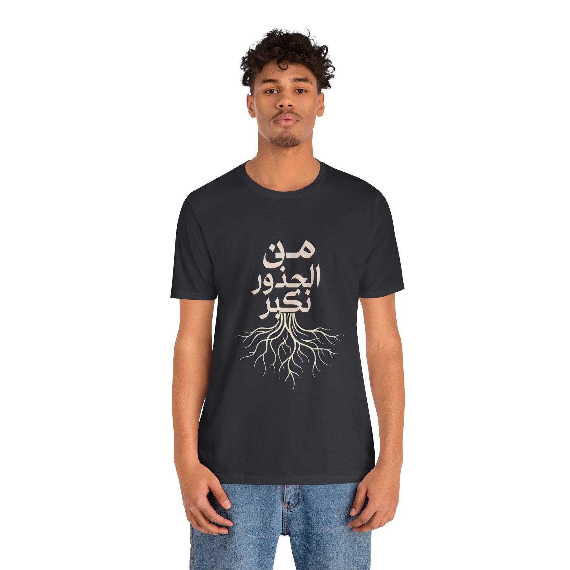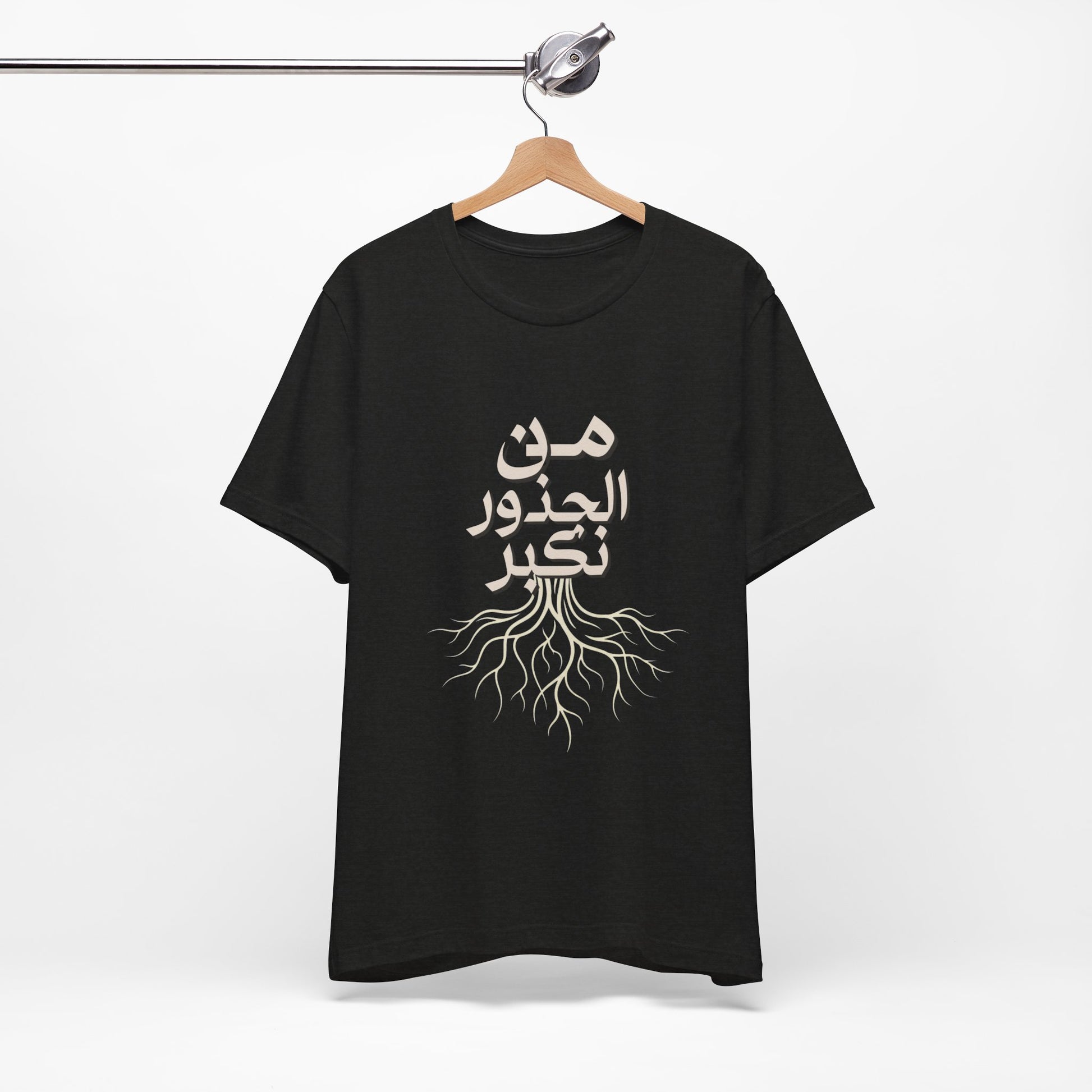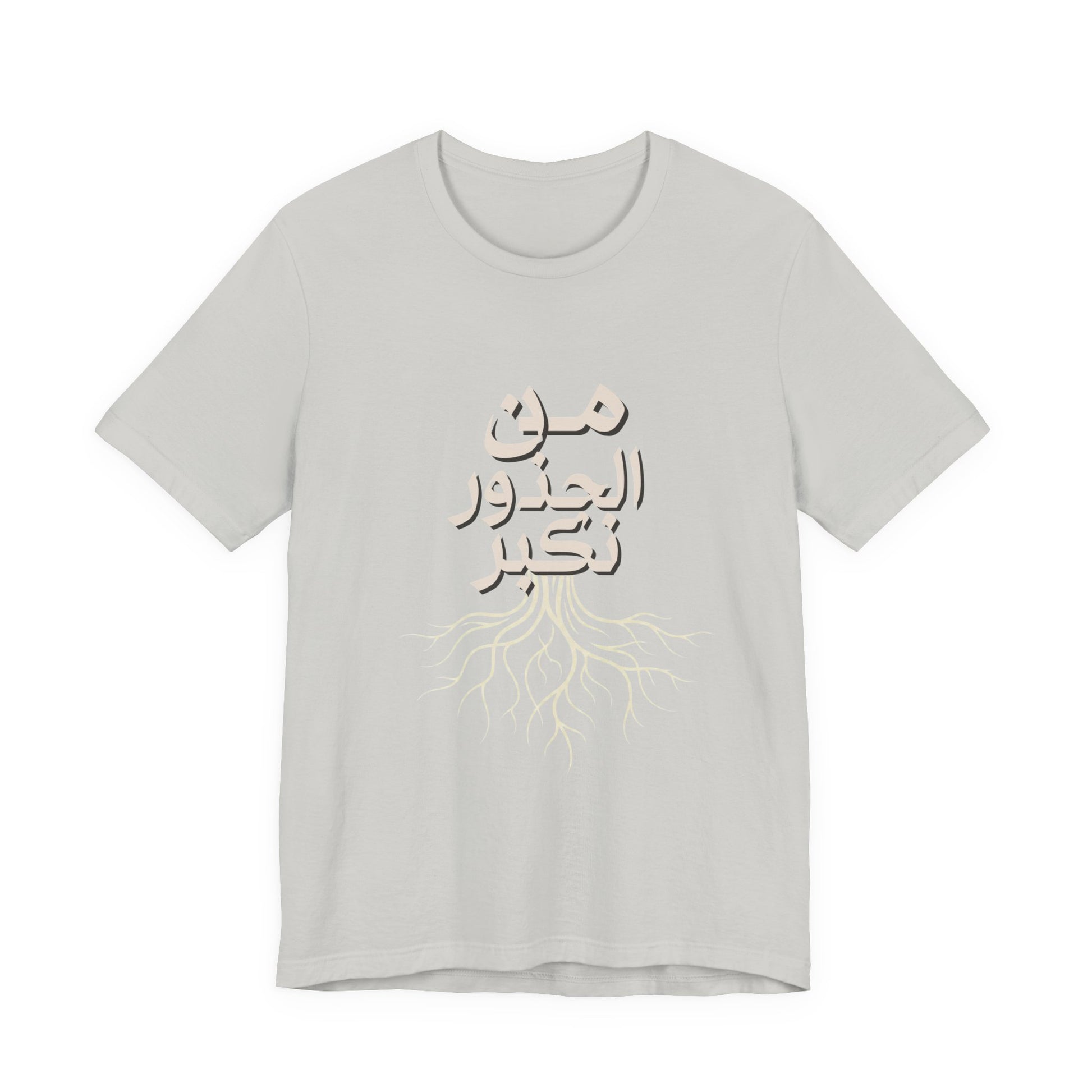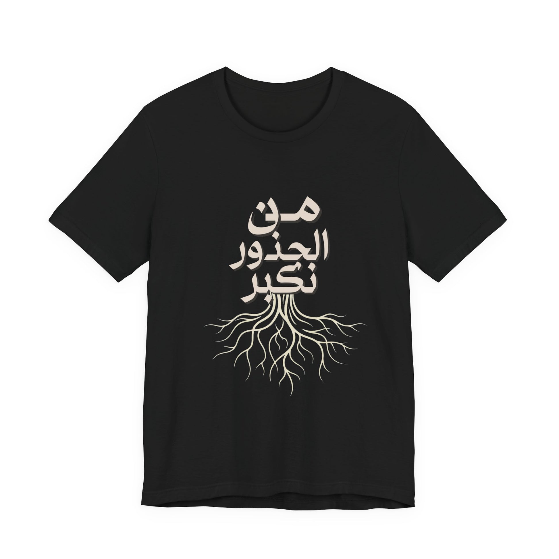 Soft, breathable, and quietly meaningful — this tee carries the Arabic phrase من الجذور نكبر (We Grow From the Roots) across the chest, a simple reminder of origins and steady growth. The lightweight Bella+Canvas fabric feels gentle against skin and layers easily under jackets or over hoodies. Subtle ribbed collar and side seams keep the silhouette neat, while shoulder tape preserves the shape after many wears. The printed label and sleeves use modern printing techniques for crisp lettering that stands out without feeling loud. Worn by people who honor lineage, resilience, and slow, steady progress, this shirt sits comfortably in everyday life — from neighborhood walks to casual gatherings and reflective moments at home. It’s part of the Roots Collection, made and sourced with attention to ethical manufacturing and REACH compliance, so the story behind the shirt matters as much as the message on it.