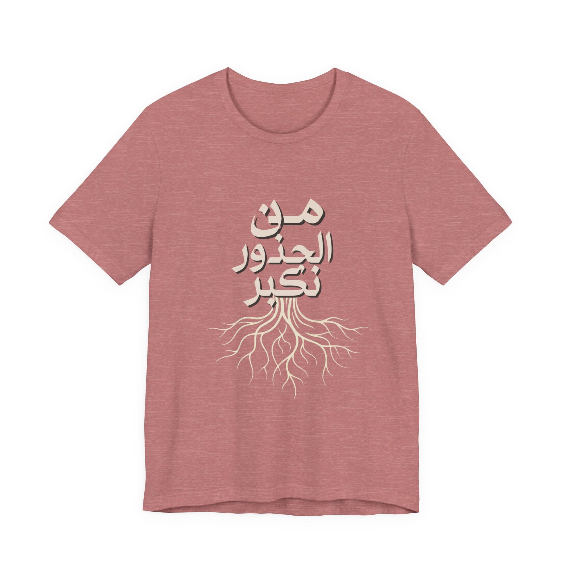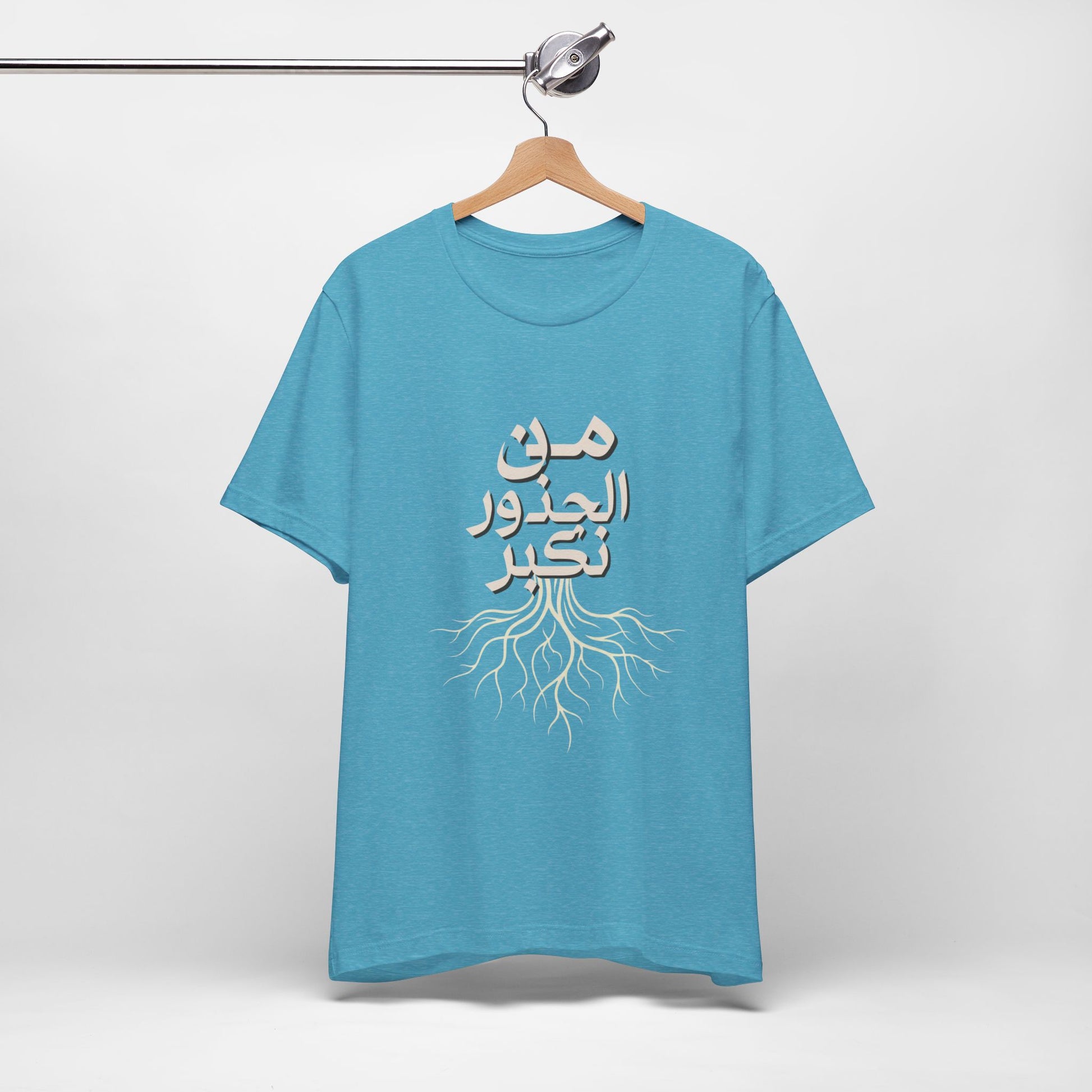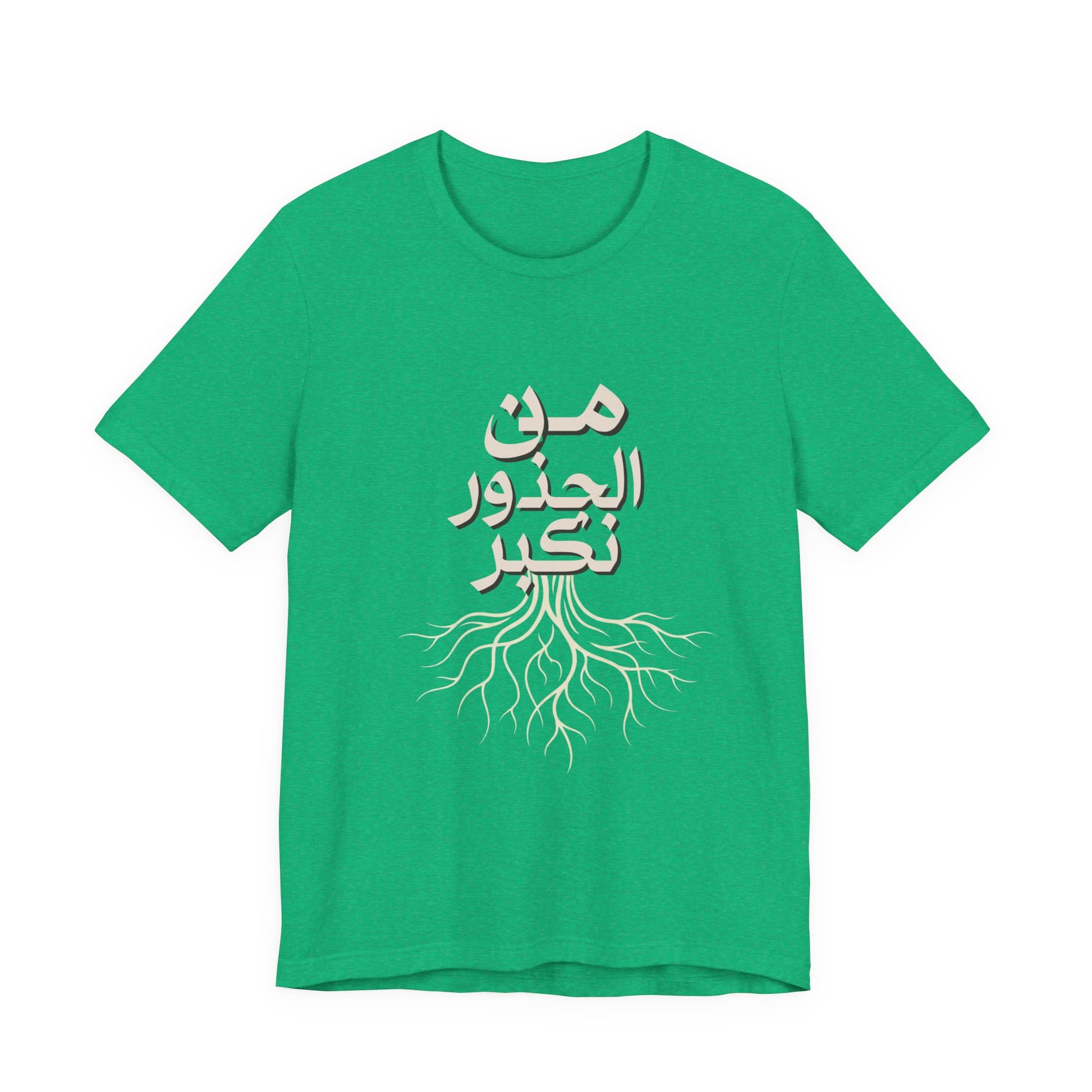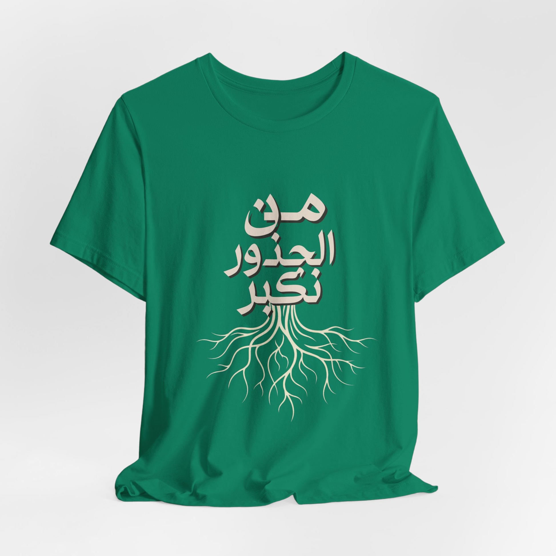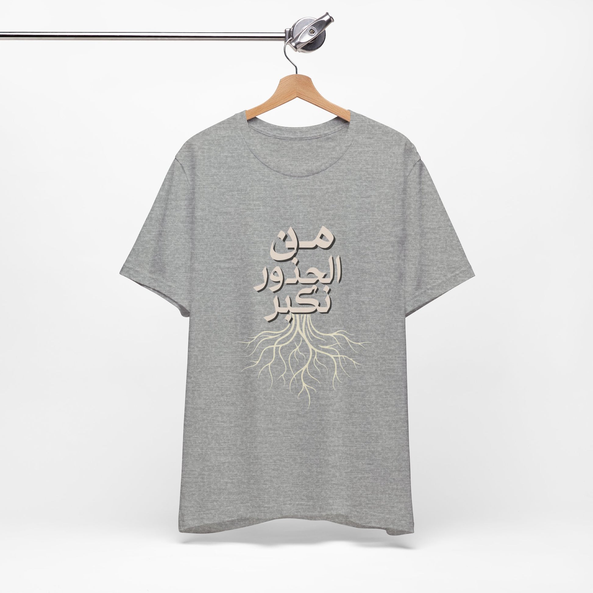Soft, breathable, and quietly meaningful — this tee carries the Arabic phrase من الجذور نكبر (We Grow From the Roots) across the chest, a simple reminder of origins and steady growth. The lightweight Bella+Canvas fabric feels gentle against skin and layers easily under jackets or over hoodies. Subtle ribbed collar and side seams keep the silhouette neat, while shoulder tape preserves the shape after many wears. The printed label and sleeves use modern printing techniques for crisp lettering that stands out without feeling loud. Worn by people who honor lineage, resilience, and slow, steady progress, this shirt sits comfortably in everyday life — from neighborhood walks to casual gatherings and reflective moments at home. It’s part of the Roots Collection, made and sourced with attention to ethical manufacturing and REACH compliance, so the story behind the shirt matters as much as the message on it.