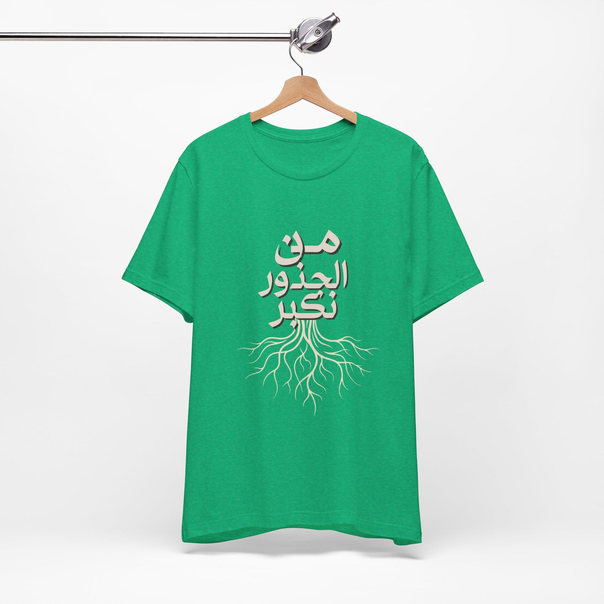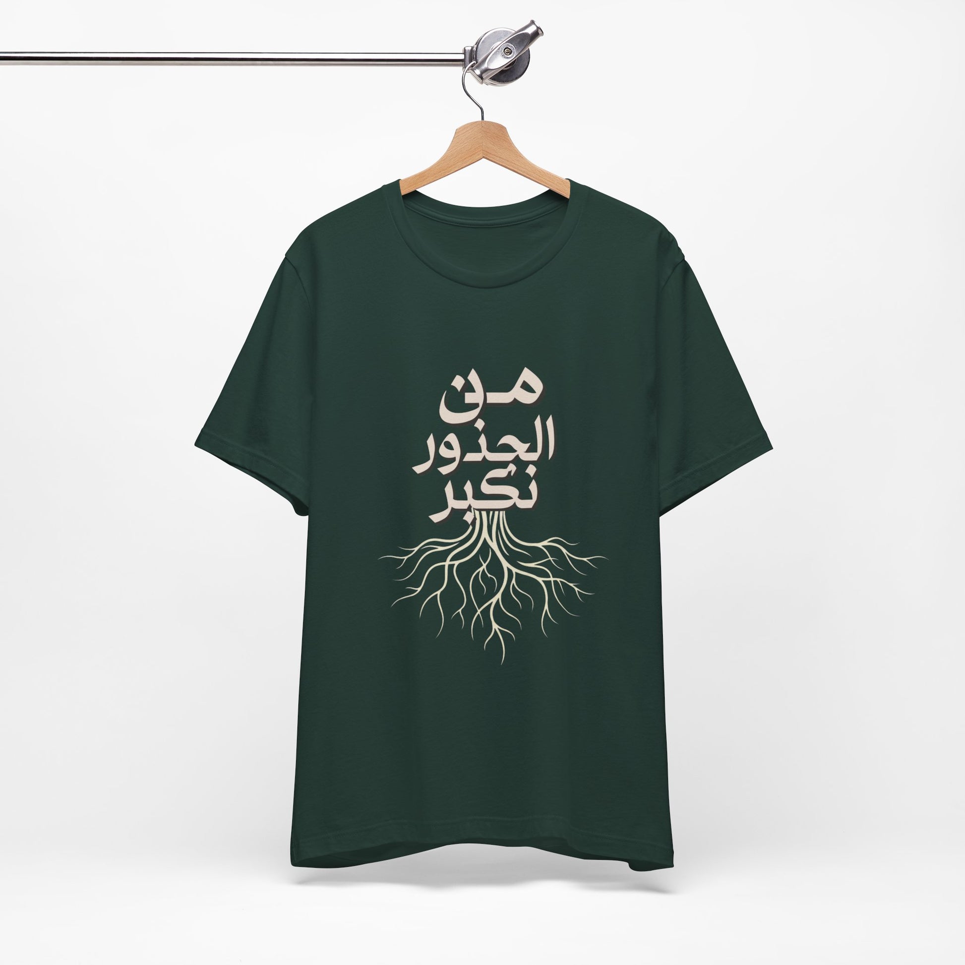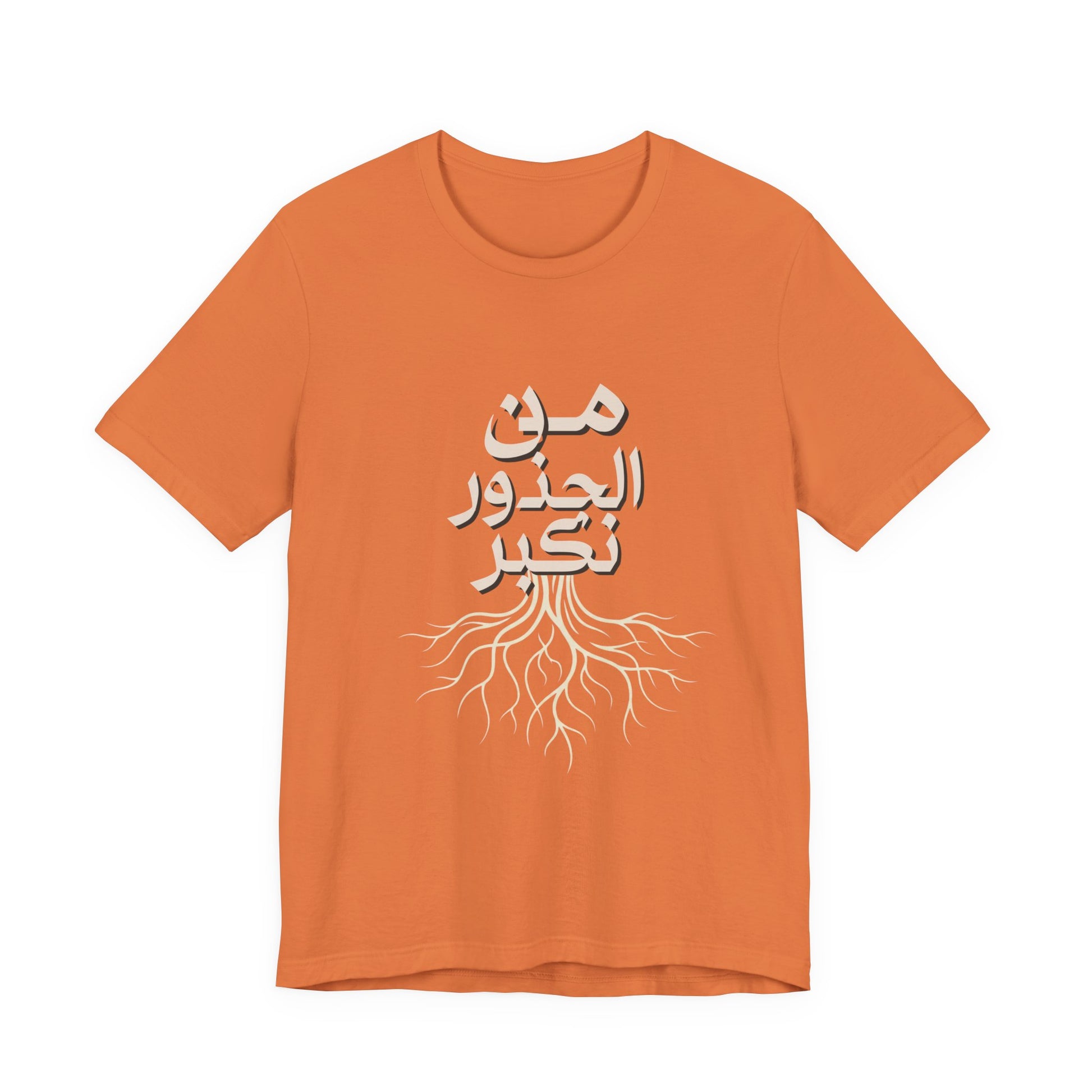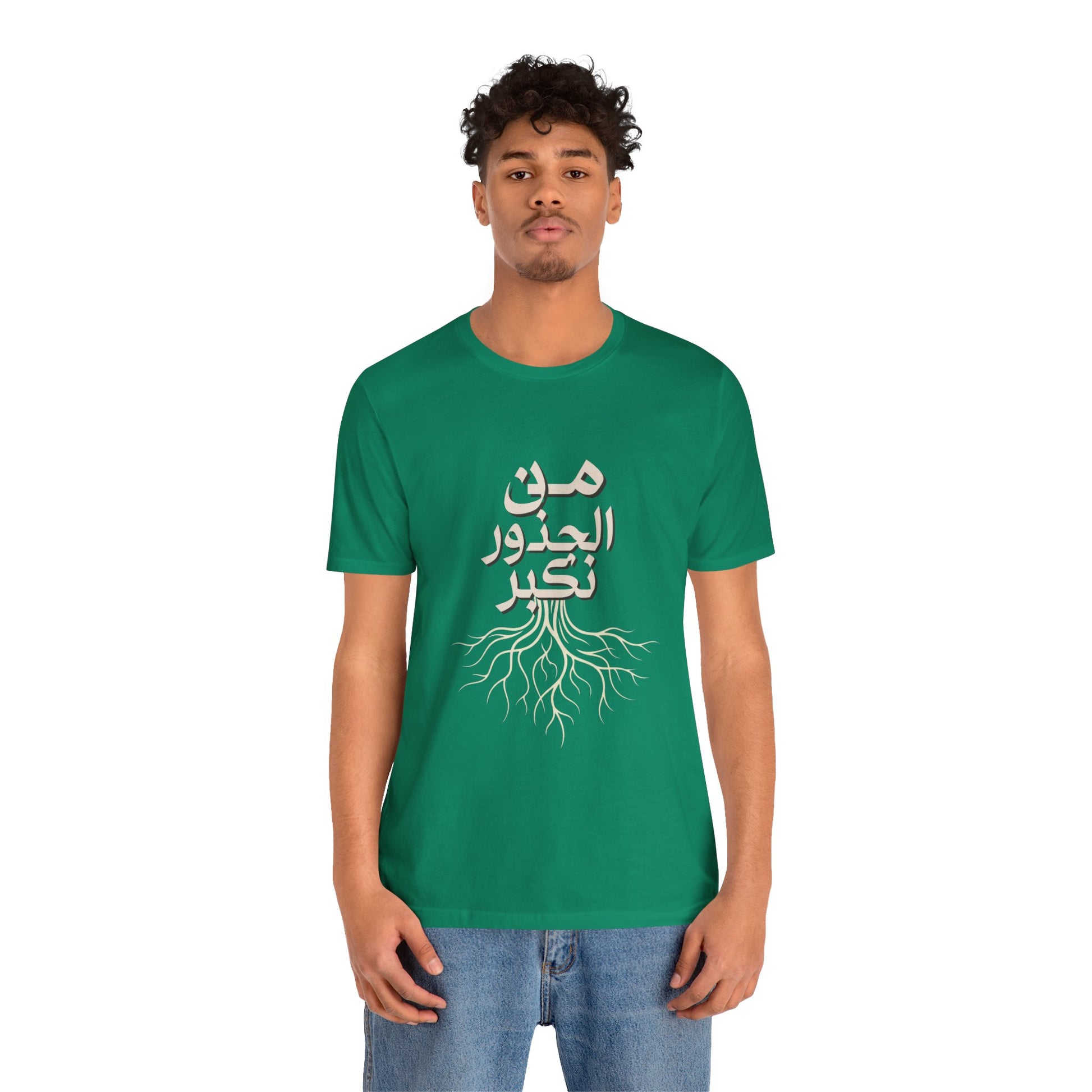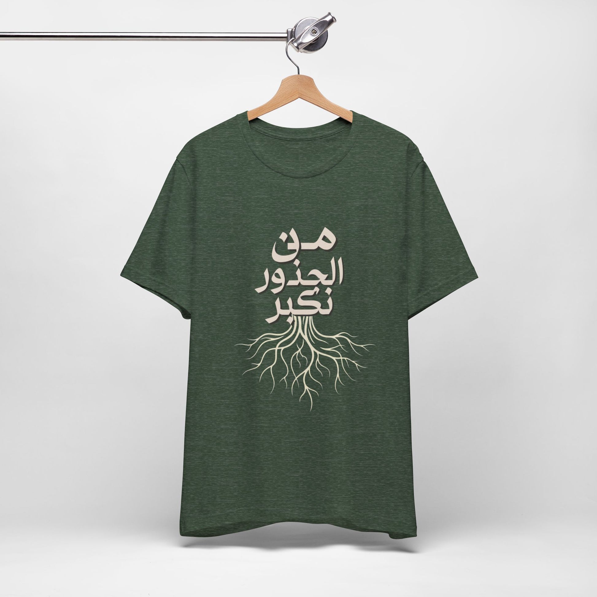 Soft, breathable, and quietly meaningful — this tee carries the Arabic phrase من الجذور نكبر (We Grow From the Roots) across the chest, a simple reminder of origins and steady growth. The lightweight Bella+Canvas fabric feels gentle against skin and layers easily under jackets or over hoodies. Subtle ribbed collar and side seams keep the silhouette neat, while shoulder tape preserves the shape after many wears. The printed label and sleeves use modern printing techniques for crisp lettering that stands out without feeling loud. Worn by people who honor lineage, resilience, and slow, steady progress, this shirt sits comfortably in everyday life — from neighborhood walks to casual gatherings and reflective moments at home. It’s part of the Roots Collection, made and sourced with attention to ethical manufacturing and REACH compliance, so the story behind the shirt matters as much as the message on it.