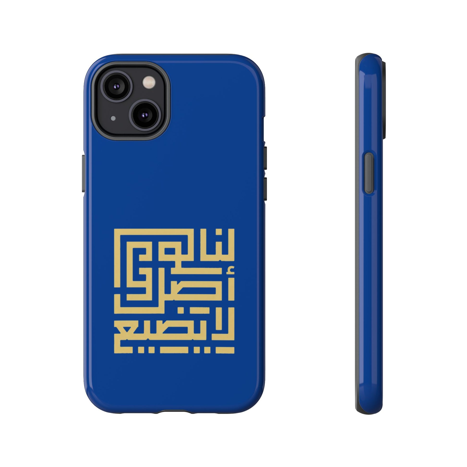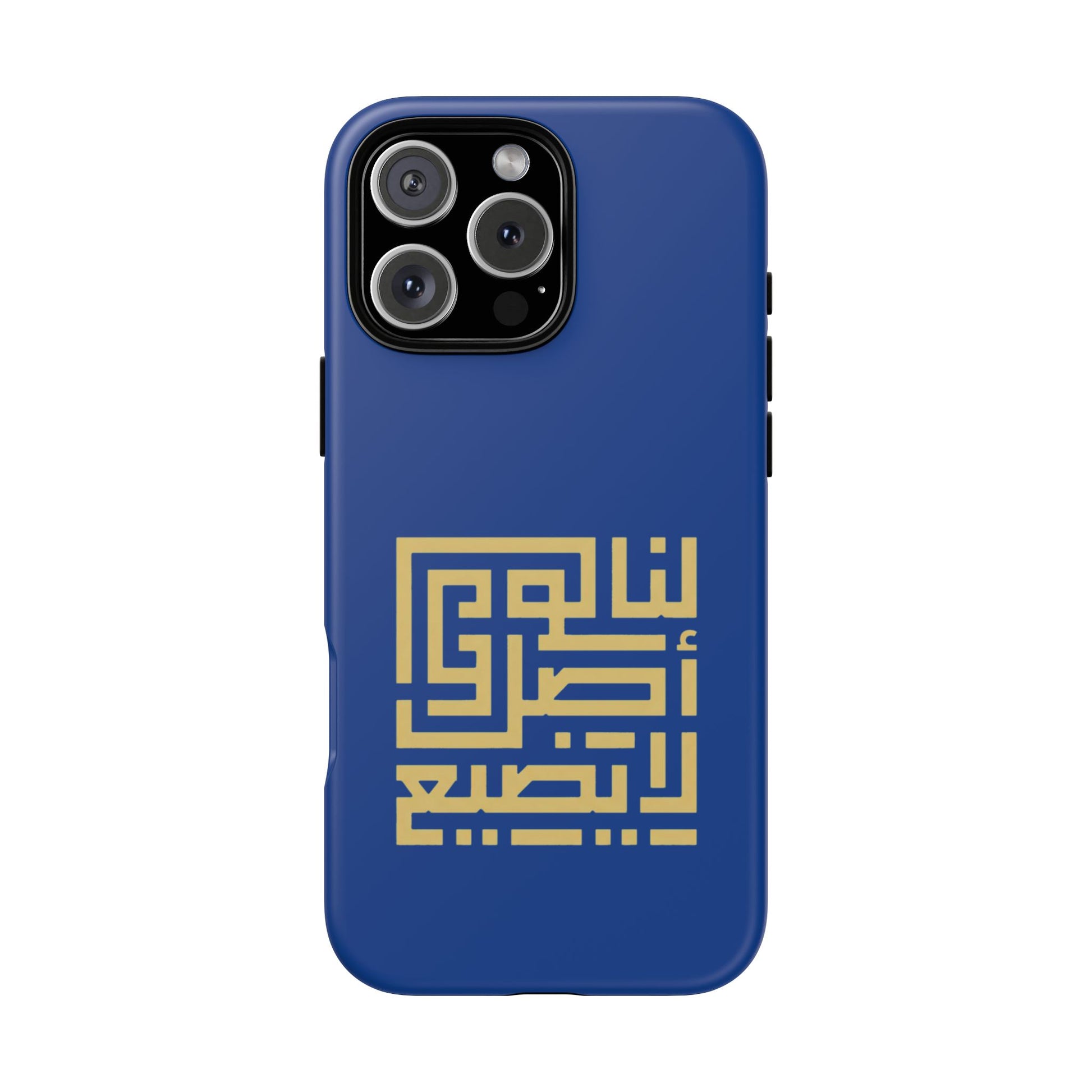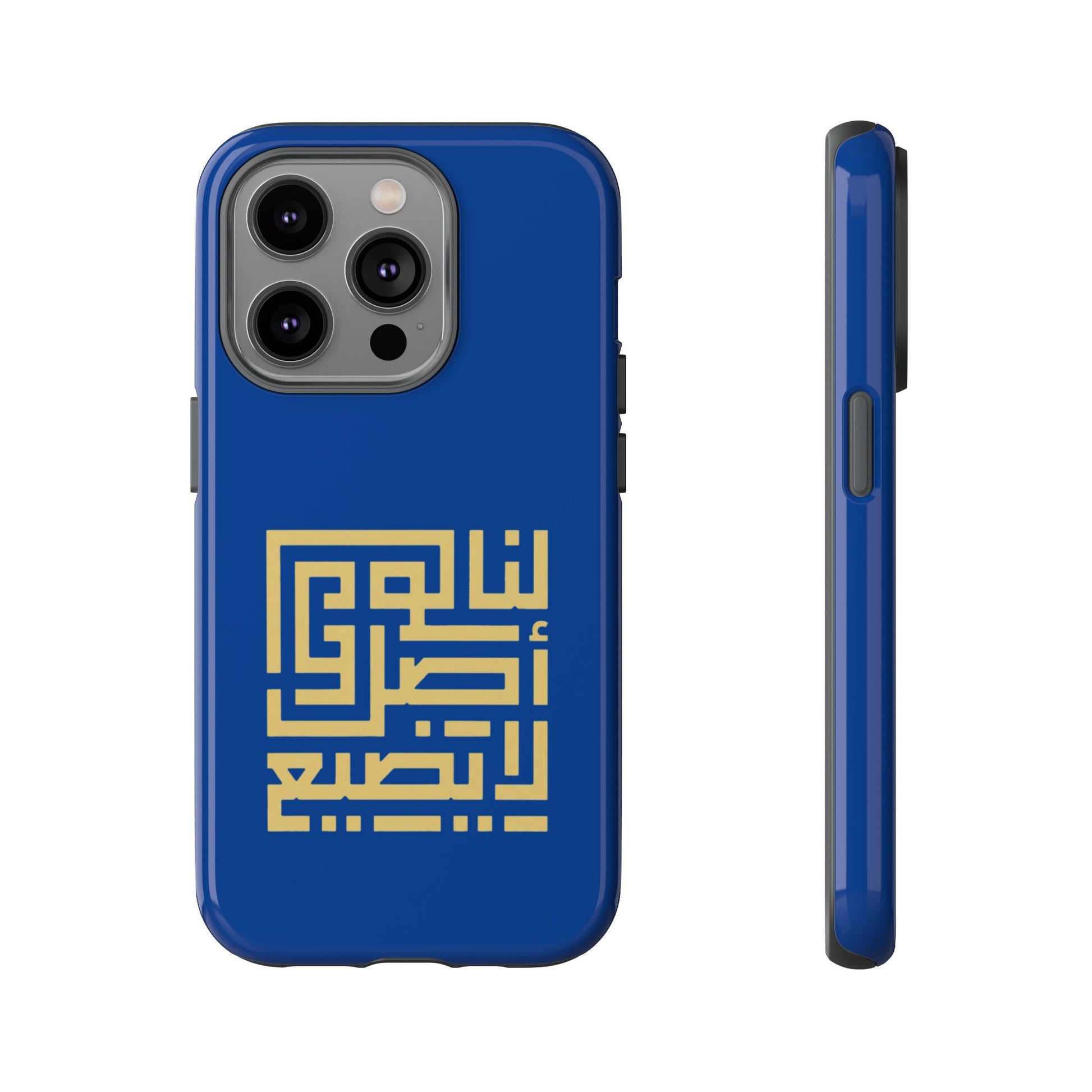 A slim, dual-layer phone case that combines modern protection with bold, geometric Arabic calligraphy. The glossy deep-blue shell is wrapped with a high-density image transfer, showcasing a gold kufic-style motif that reads with clarity and strong visual presence. Inside, a soft TPU silicone liner cushions accidental drops while the rigid polycarbonate outer shell resists impacts and scratches. Weather-ready finishes resist UV fading and the case supports wireless charging while keeping ports accessible. It wears like a piece of personal expression—clean lines, cultural character, and dependable everyday protection.
